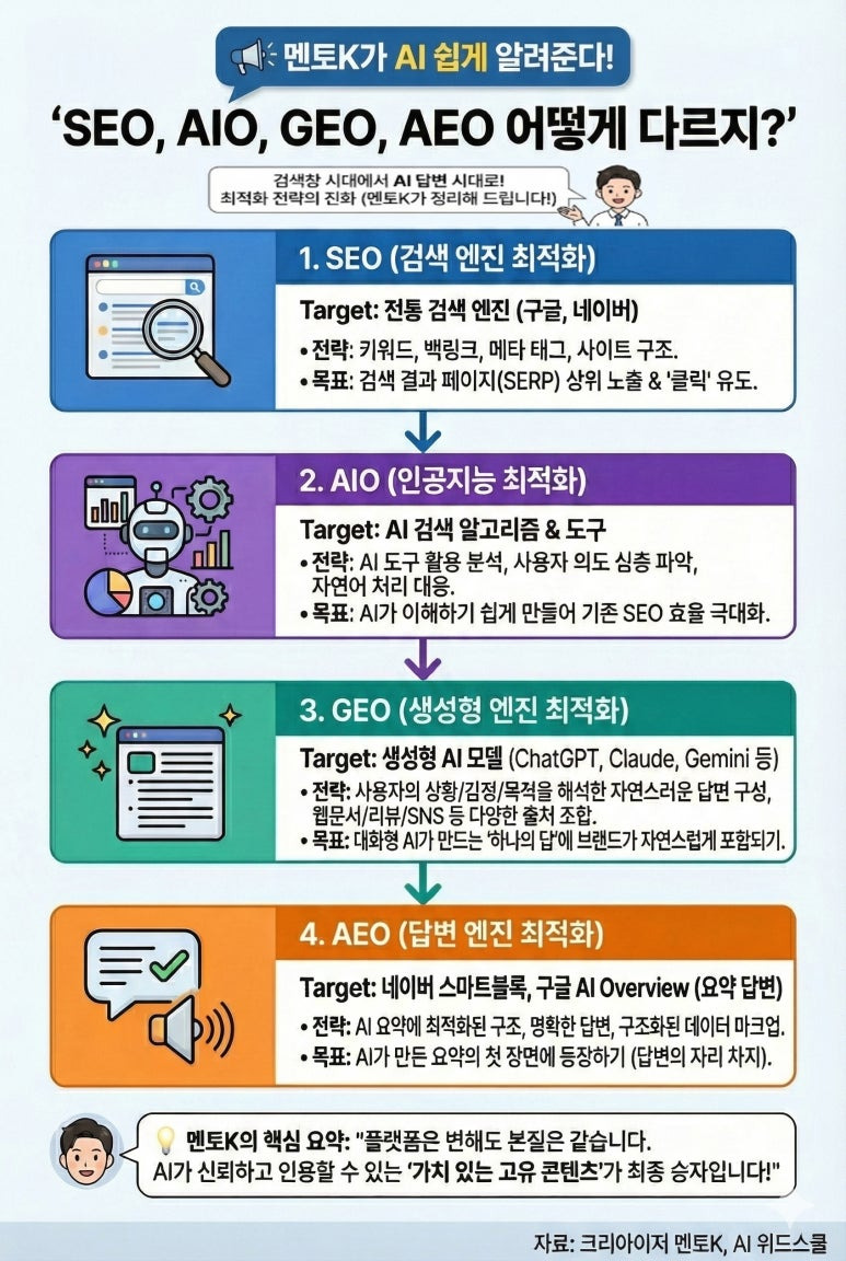 AI 최적화(AIO), 생성형 AI 최적화(GEO), 답변엔진 최적화(AEO)의 개념은 아래 포스터에서 확인하시고, 변화하는 시대 AIO, GEO, AEO에 대해 더 알고 싶다면...