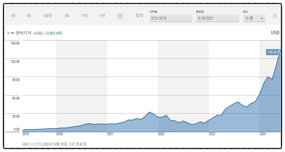 아래는 주요 연도별 엔비디아의 주가를 그래프로 나타낸 것이다.
