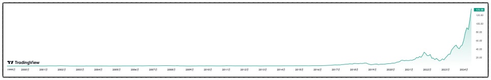 엔비디아의 창업 이후 기업가치와 주가는 꾸준히 성장해왔다. 특히, 2010년대 후반과 2020년대 초반에 걸쳐 AI와 데이터센터 기술에 대한 수요가 급증하면서 엔비디아의 주가는 급격히 상승했다.