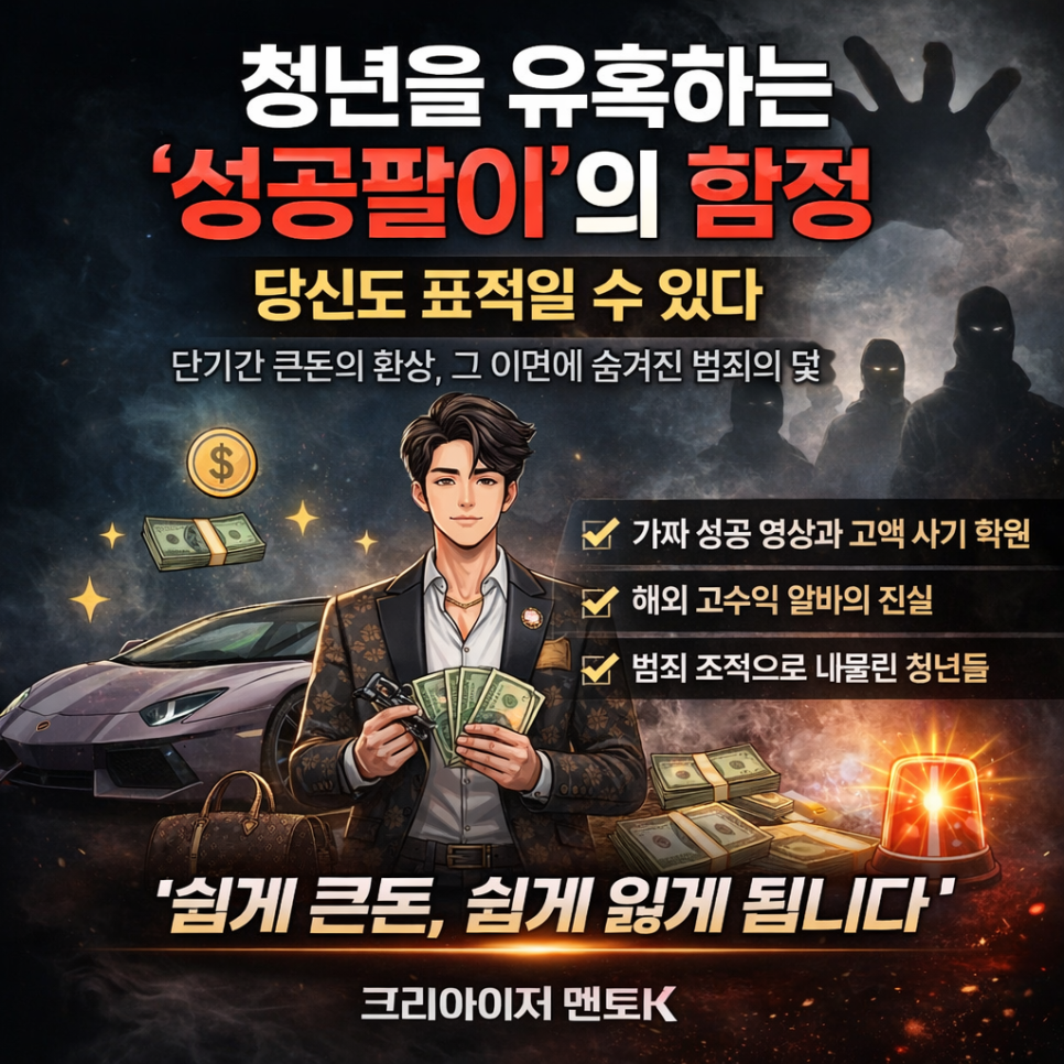 이번 글에서는 단기간 고수익을 미끼로 청년들을 덫에 빠뜨리는 성공팔이 콘텐츠의 실체와 범죄로 이어지는 구조, 그리고 우리가 주목해야 할 사회적 문제까지 깊이 들여다본다.