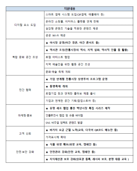 공고문에서도 필수 과업 성격으로 브랜드 정체성 및 스토리 개발, 특화상품 개발, 우수 맛집 발굴, 가이드 시장 투어, 체험 콘텐츠, 관광상품 개발, 야시장 운영, 역사관 조성, 기업 연계형 상생투어, 인플루언서 협업, SNS 비주얼 콘텐츠, 위생·안전관리 강화 등을 제시하고 있다. 즉, 이번 사업은 단순히 시장 정비사업이 아니라 브랜드 마케팅 사업이자 관광형 콘텐츠 사업이라는 뜻이다.