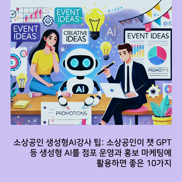 소상공인들은 챗GPT와 같은 생성형 AI를 활용하여 홍보 마케팅 기획부터 콘텐츠 제작에 이르기까지 다양한 방식으로 점포 운영을 지원할 수 있다.