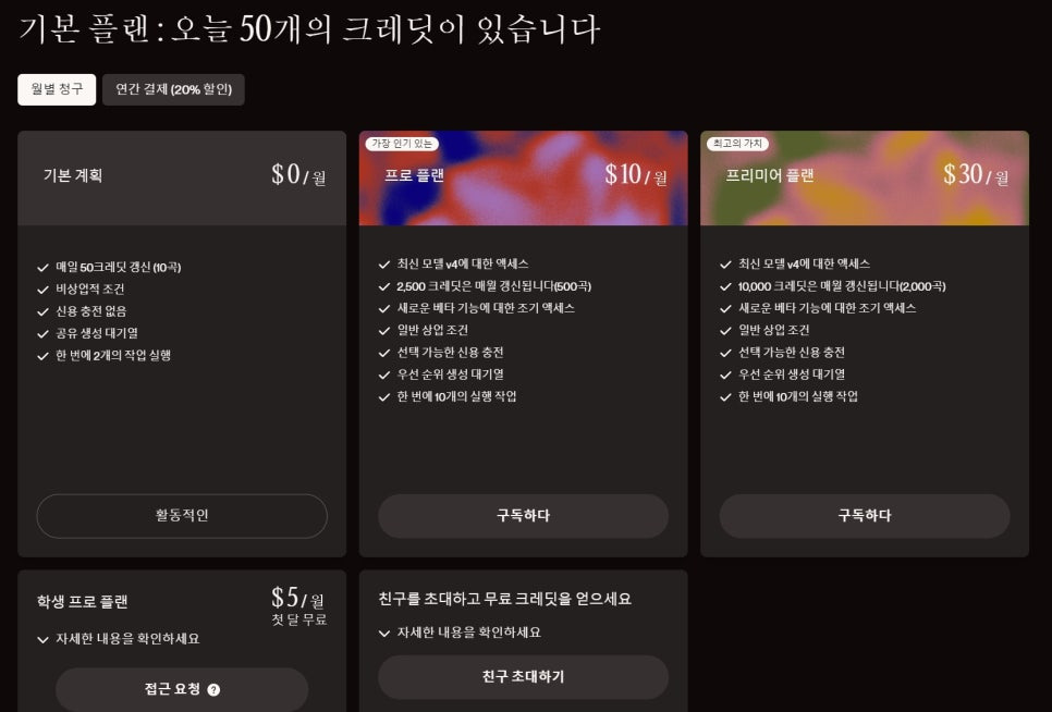 - 음악 생성 가능 횟수: 월 최대 1,000곡 생성 가능
