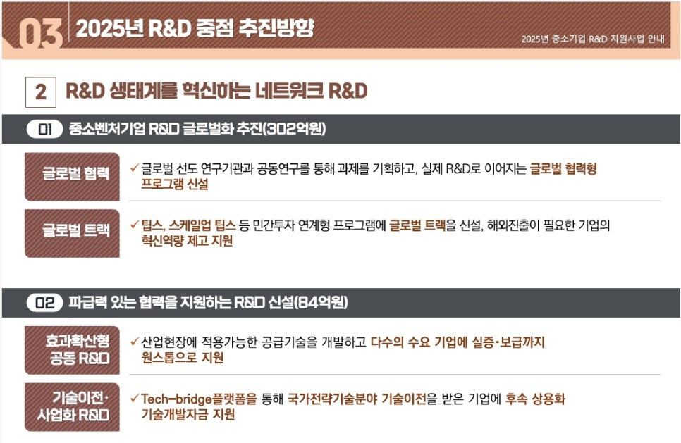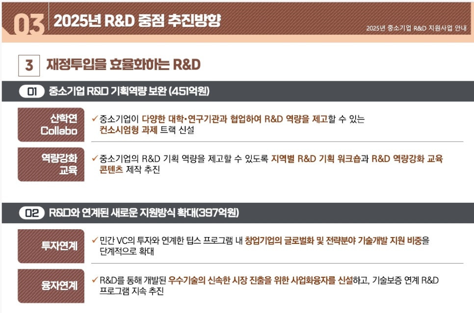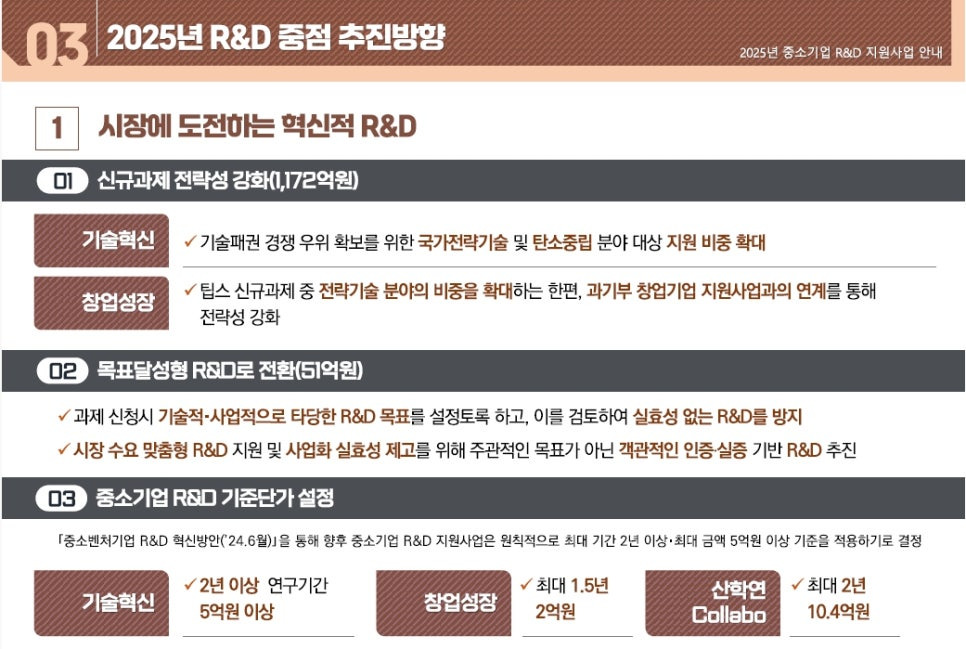 2025년 중소벤처기업부의 연구개발 지원 방향은 기술력 있는 중소기업과 스타트업이 성장할 수 있도록 전략적으로 설계되었다.