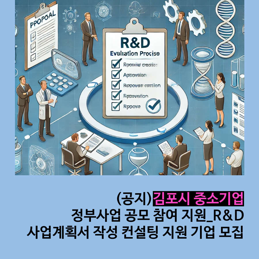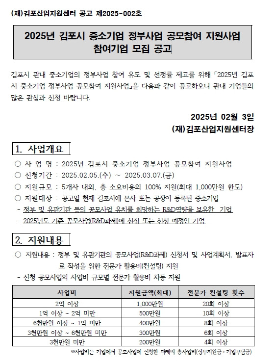**2025년 김포시 소재 중소기업을 대상으로 한 정부사업 공모(중소벤처기업부 등 정부 각 부처 R&D(연구개발) 지원사업 접근을 위한 R&D과제 기획, 연구개발계획서 작성, 발표 자료 작성 등의 컨설팅을 위한 전문가 활용비를 김포산업지원센터가 지원하고 있습니다. ( ~3월 7일까지 신청서 접수)