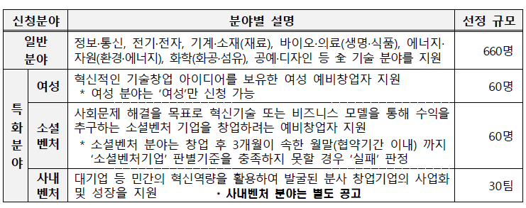 - 여성 창업 및 소셜벤처, 사내벤처 분야 지원 확대