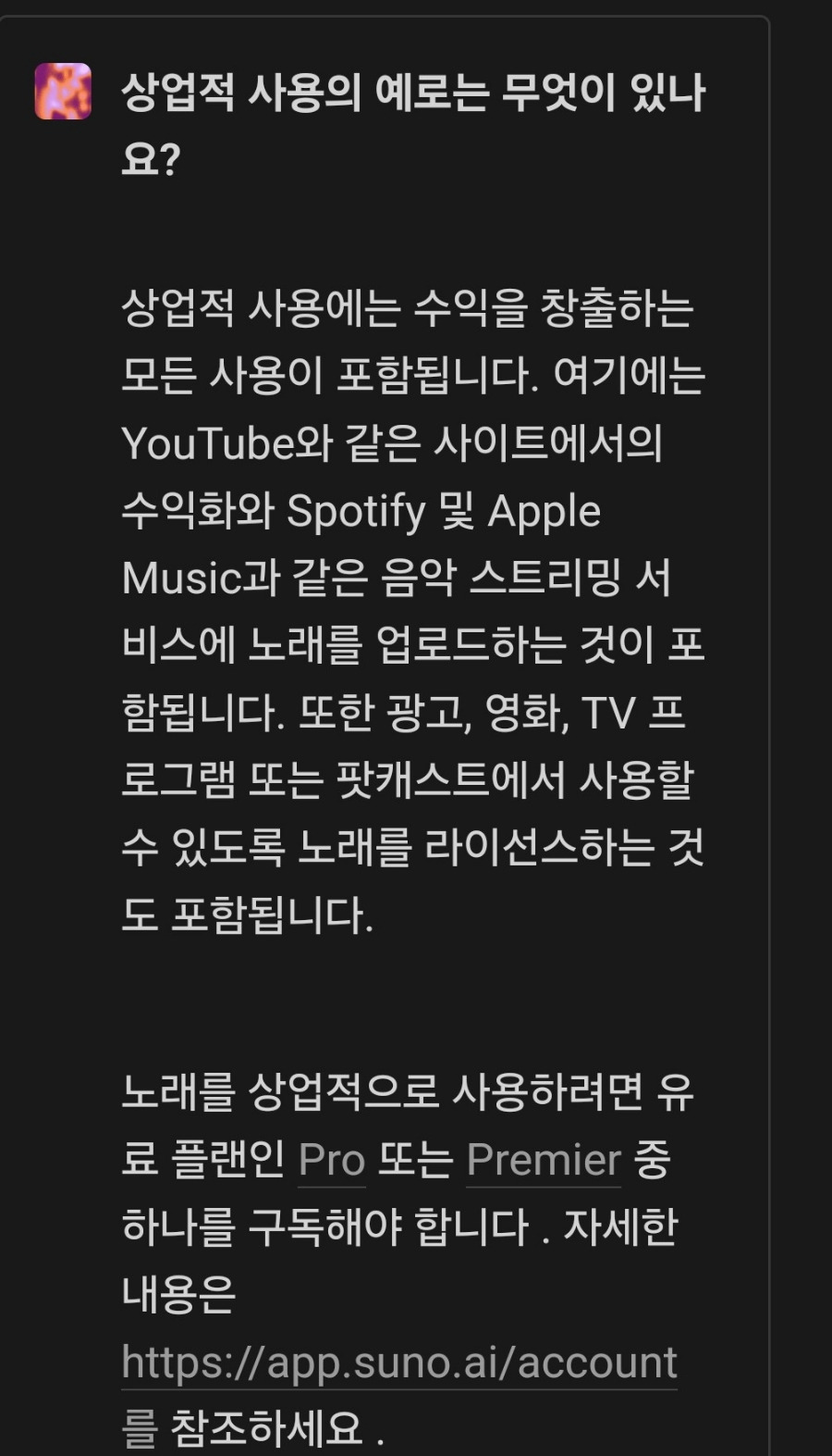 ✅ AI 음악은 광고, 유튜브 BGM, 게임 음악 등에서 활용될 수 있다. 플랫폼의 유료 사용자 한정 등의 정책 확인 필요..