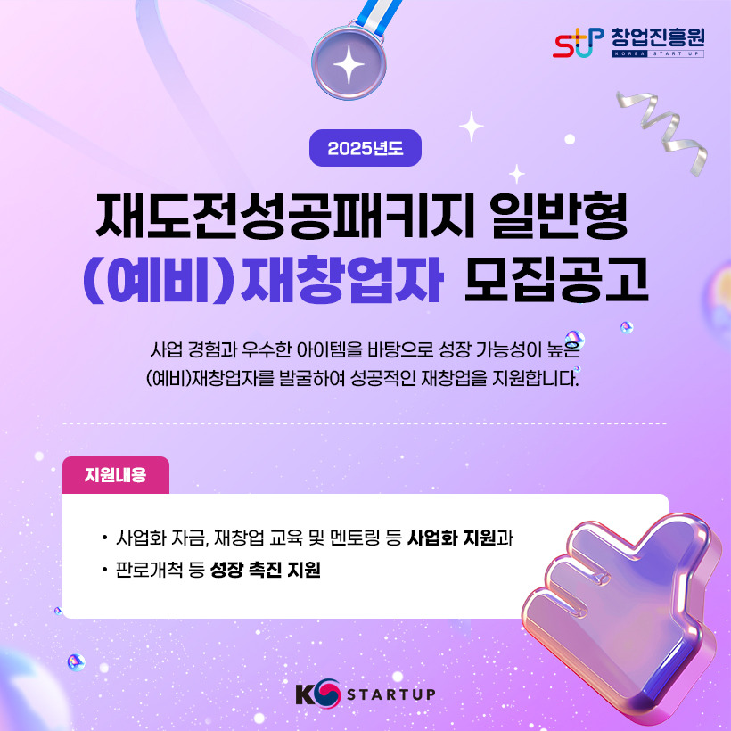 ※ 자세한 내용은 하단의 '2025년 재도전성공패키지 일반형 (예비)재창업자 모집 공고'와