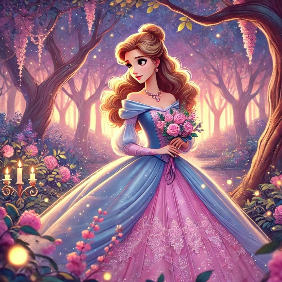 “a classic Disney princess in a magical forest, soft lines, elegant dress, romantic atmosphere”