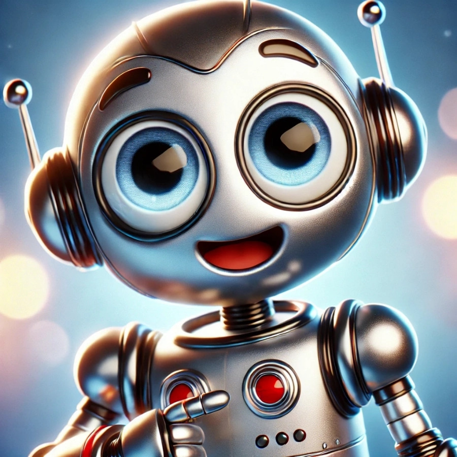 “a cheerful robot character in Pixar animation style, expressive face, glossy finish, cinematic lighting”