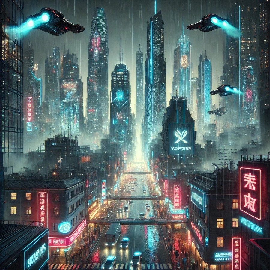 “a futuristic cyberpunk city at night, neon lights, flying cars, rain-soaked streets, dystopian skyline”