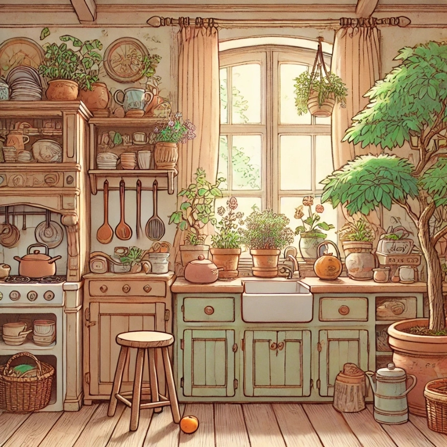 -따뜻한 주방, 빈티지 가구, 작은 식물 화분